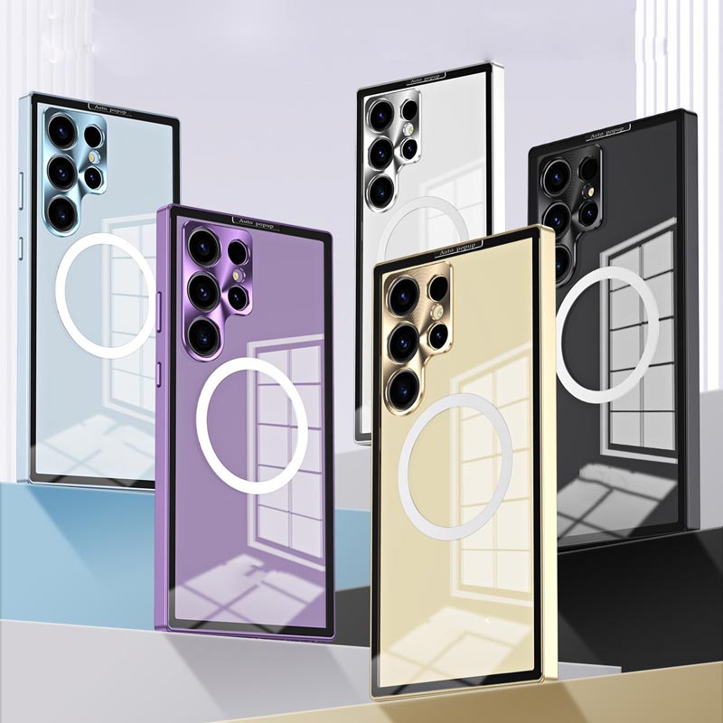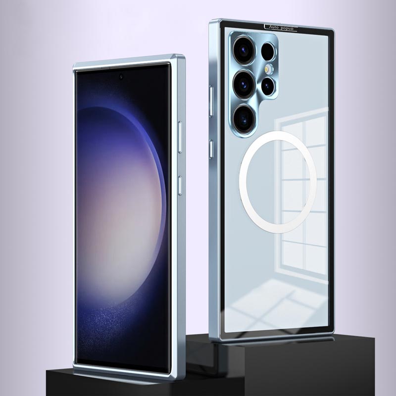 Upgrade Luxusní automatické vysouvací pouzdro s kovovým rámečkem a ochranou čočky Magnetické průhledné pouzdro na telefon pro Samsung
